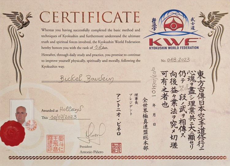 8 jaar geleden is mijn dochter Valence (1ste dan) begonnen met Kyokushin en korte tijd daarna werd ik door Sensei Andre gestimuleerd om ook weer te beginnen. Ik ben weer met volle overtuiging begonnen en uiteindelijk beloond in juli 2023 met het behalen van mijn shodan (1ste dan).Kyokushin betekent voor mij het uiterste uit jezelf halen, respectvol met elkaar omgaan. De intensieve trainingen zorgt voor een conditioneel, sterk en gezond lichaam. Stilstand is uiteindelijk achteruitgang.
